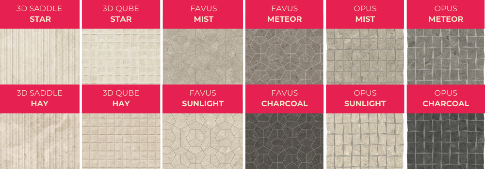 Pro všechny jsou typické jemné žilkování a strukturované povrchy včetně trojrozměrných ve verzi horizontálních linií (3D Saddle) a kostiček (3D Qube). Kolekci doplňuje dvojice mozaikových dekorů, hexagonální Favus a cihličkový Opus. Textury nejsou samoúčelné – mají hmatovou kvalitu, která zesiluje smyslový vjem a autentičnost materiálu, jenž od pravého kamene nerozeznáte.