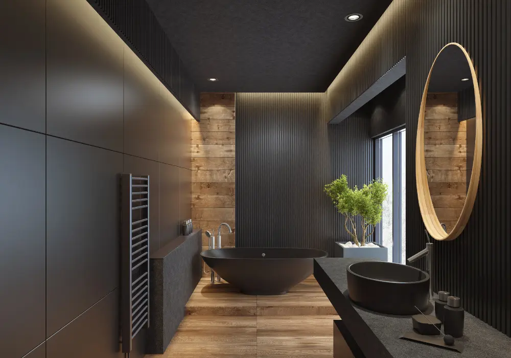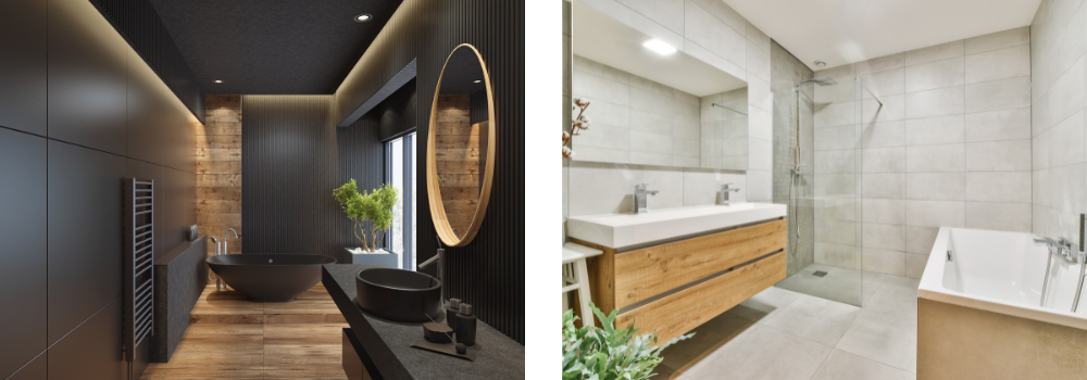Jak tedy v moderní koupelně skloubit praktičnost a estetiku? Klíčové je vybrat neutrální, kvalitní materiály a doplnit je designovými akcenty. Velkoformátová dlažba v imitaci kamene a přírodní dekory jdou skvěle dohromady s černými bateriemi, jako třeba v našem návrhu minimalistické koupelny v jemných tónech nebo návrhu luxusní šedé koupelny v přírodním stylu.