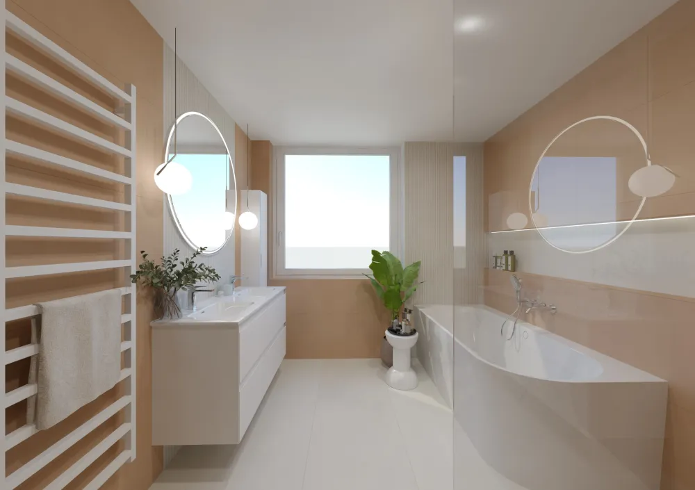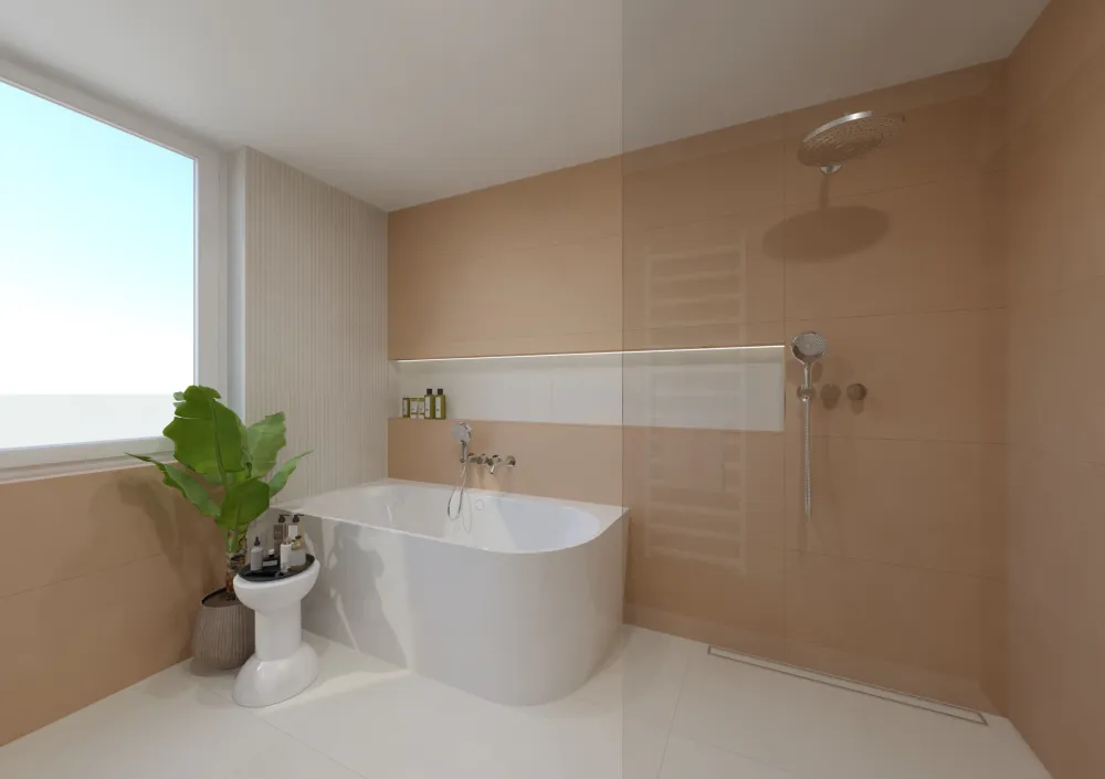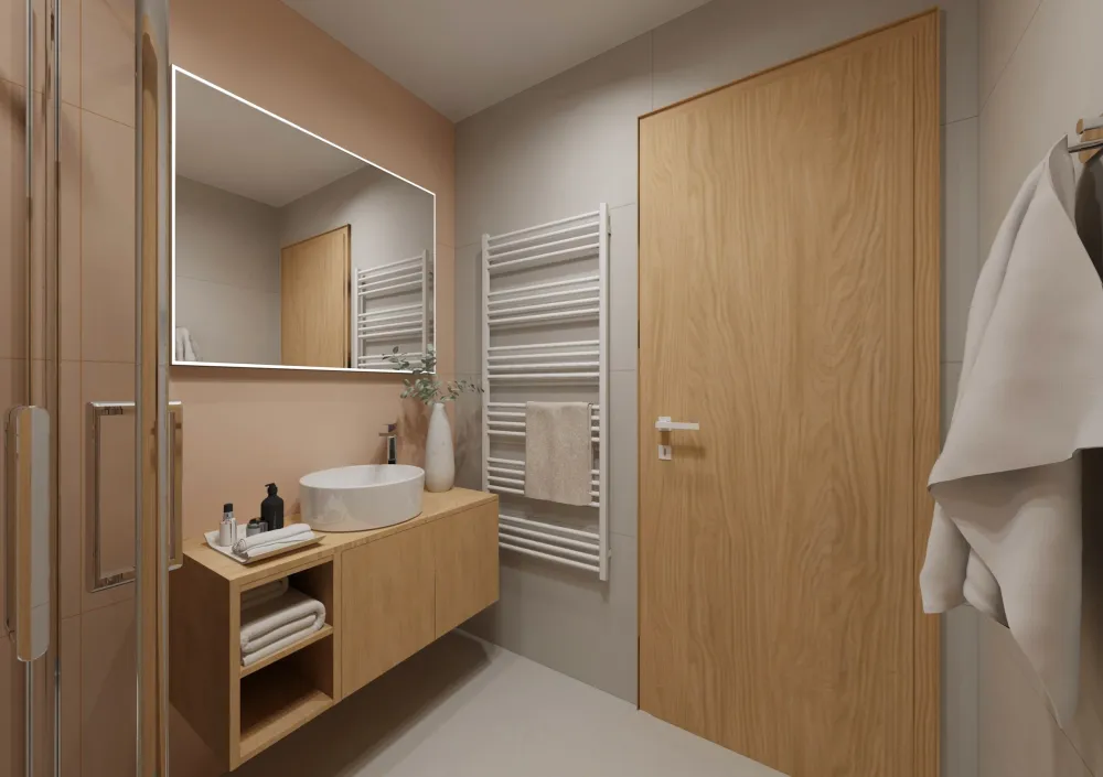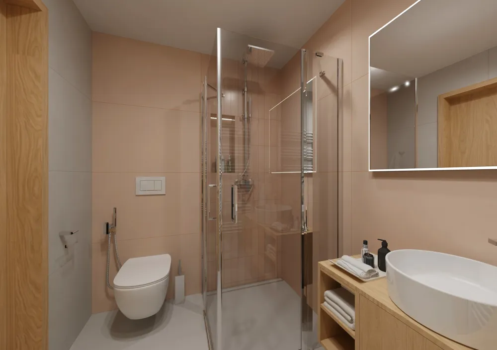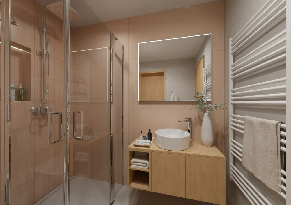 Klienti aktuálně zvažují, zda by se i hlavní koupelna mohla ladit do pudrově růžového odstínu, podobně jako ta hostovská. Jak byste to viděli vy? Dali byste přednost jemně růžové eleganci, nebo zůstali u neutrální béžové klasiky?