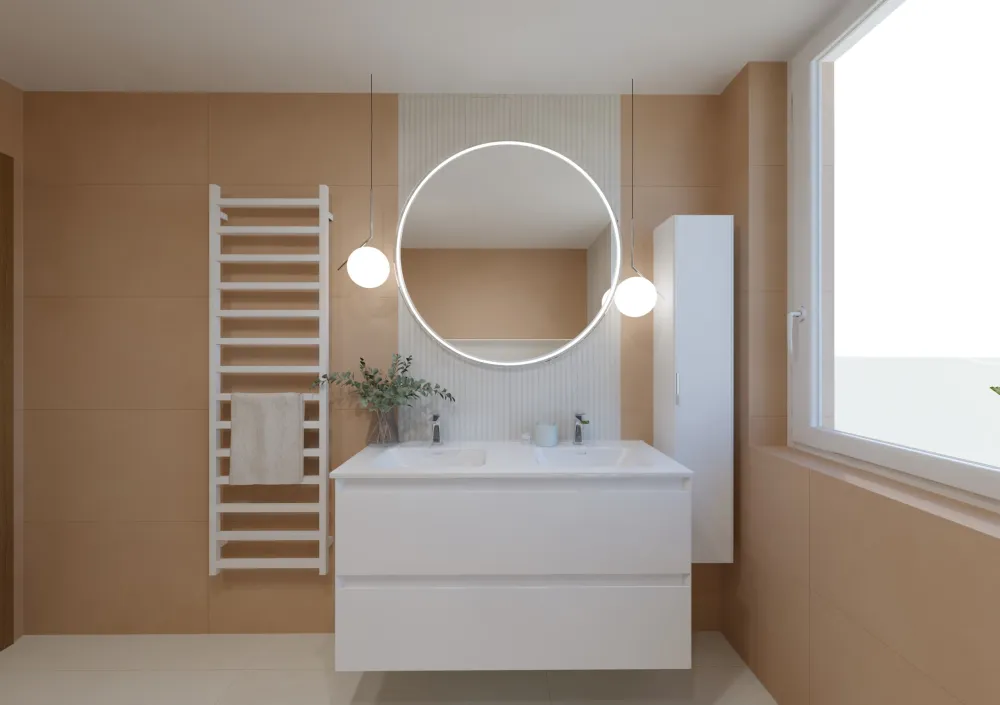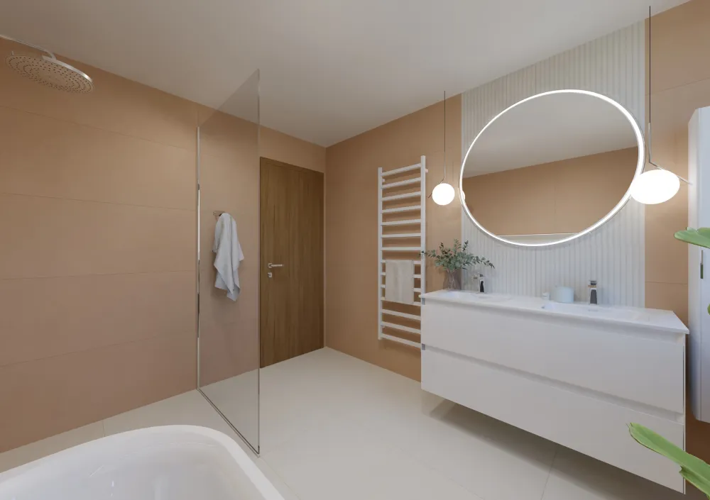 Celkový dojem dotvářejí chromové doplňky, decentní topný žebřík a jemné světlo, které odráží hřejivý odstín obkladu.