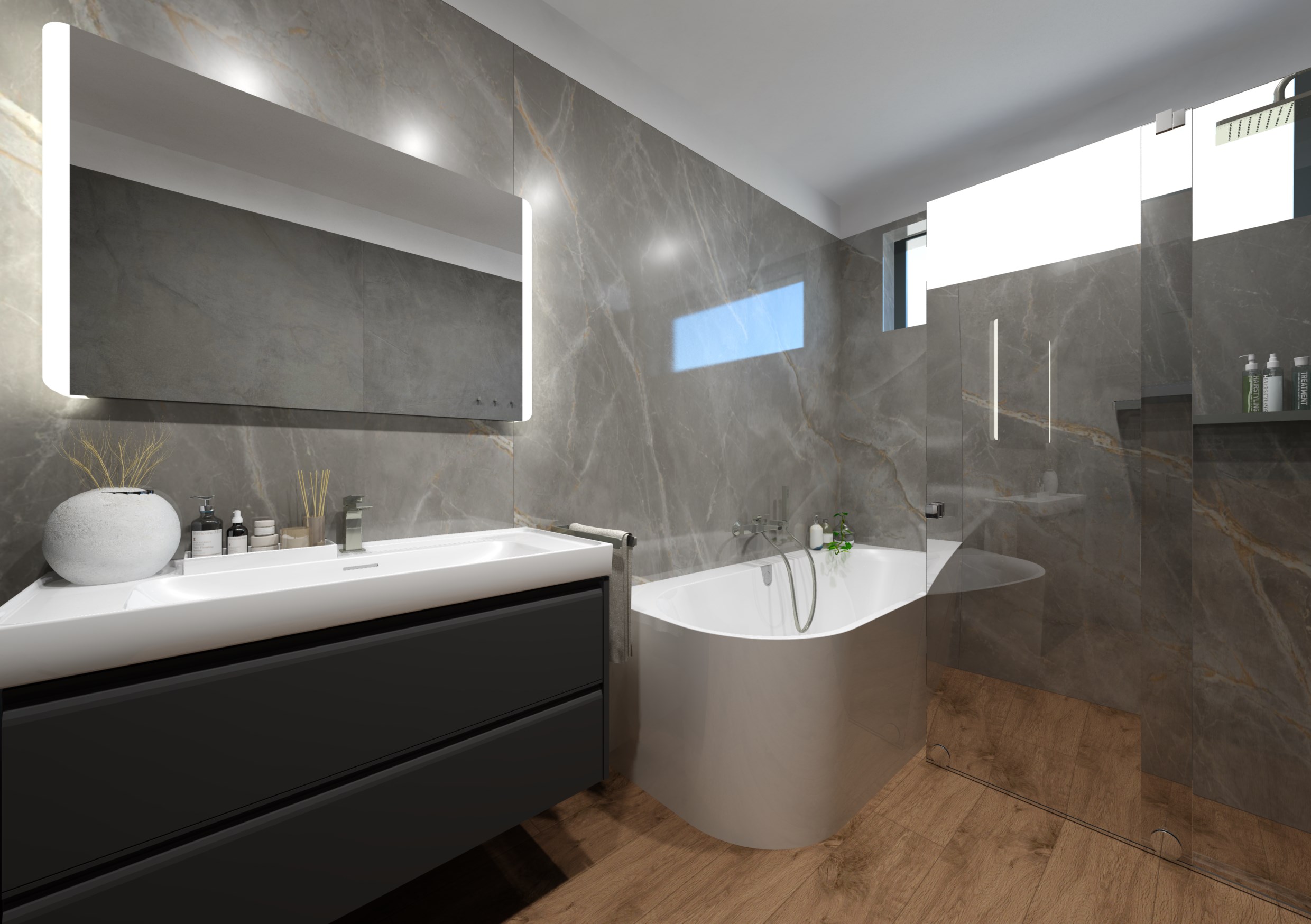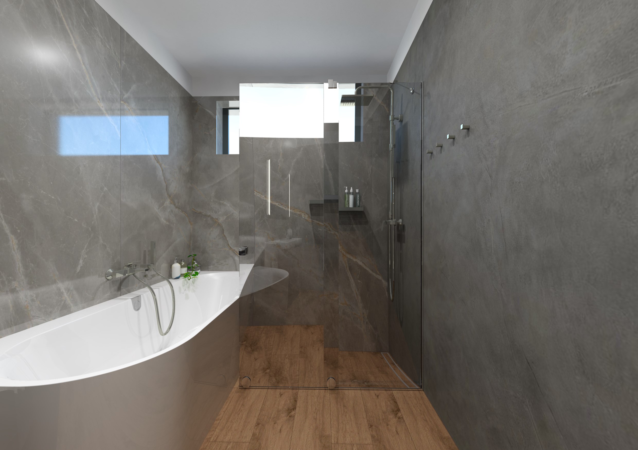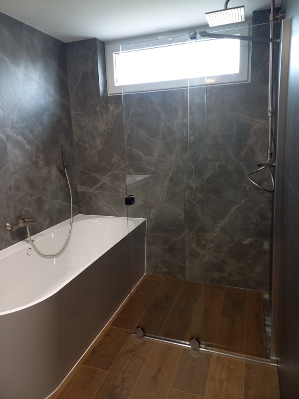 Velkým přáním majitelky bylo spojit komfort relaxační koupele s praktičností walk-in sprchy. Do prostoru se podařilo integrovat vanu Villeroy & Boch OBERON 2.1 v kompaktním rozměru 160 cm, která majitelce udělala obrovskou radost svou subtilností. Sekunduje jí moderní sprchová zástěna Hüppe XTENSA Walk-In, která je instalována přesně "od stěny ke stěně", čímž maximálně využívá každý centimetr plochy a působí neuvěřitelně lehce.