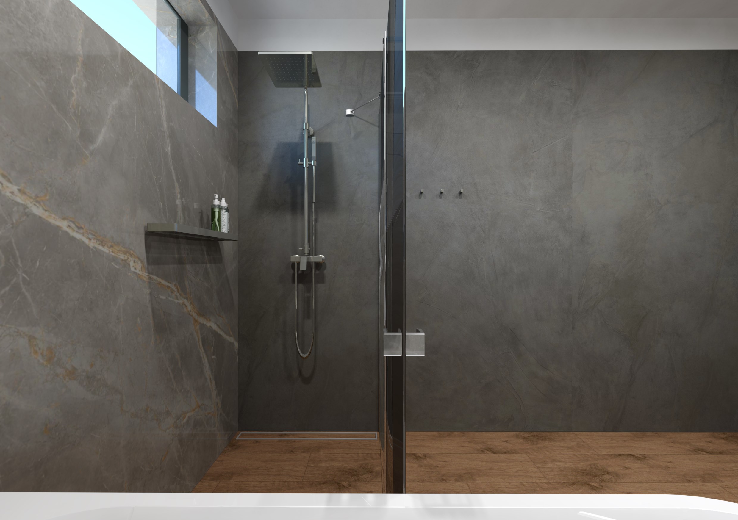 Základem této "boží" kombinace, jak ji sama klientka nazvala, se staly prvky od Atlas Concorde. Na podlaze a stěnách se potkává: