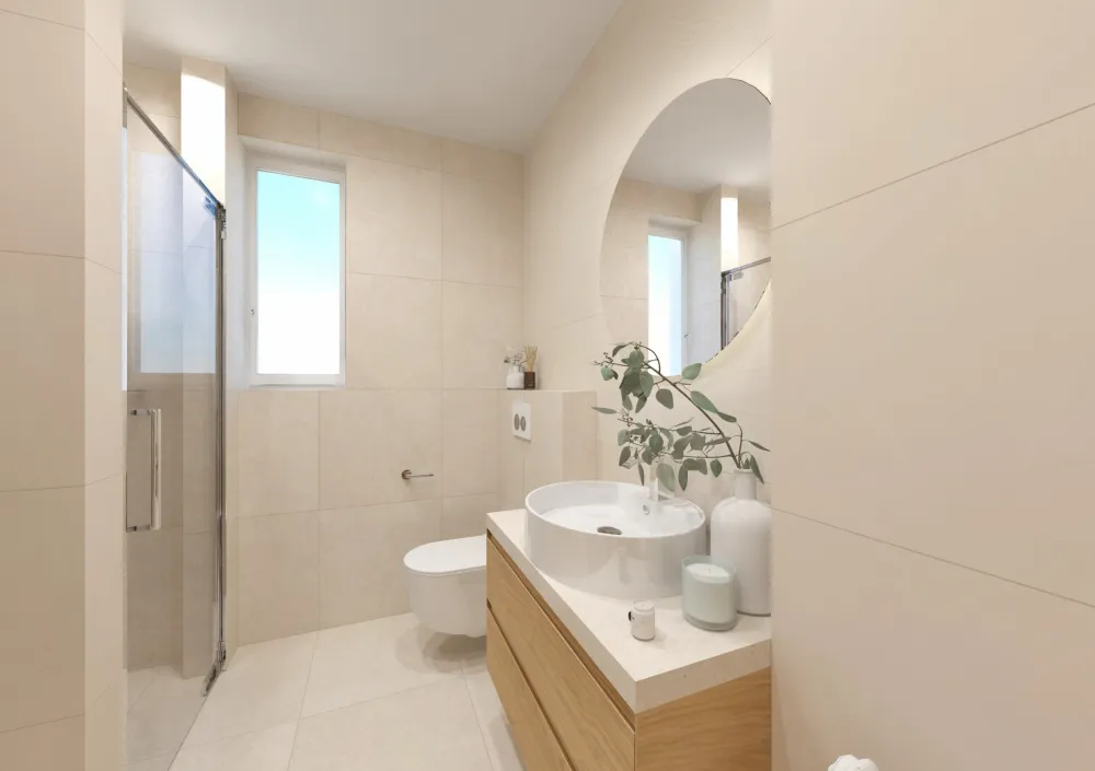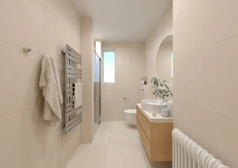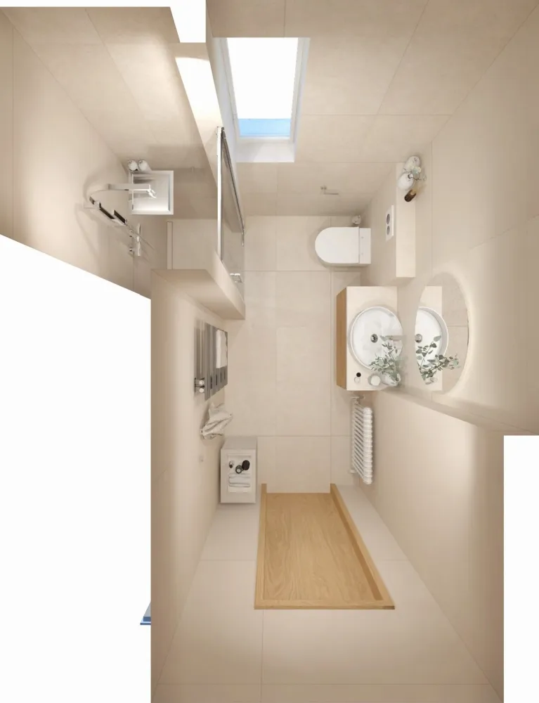 Tento návrh ukazuje, že i malá koupelna může nabídnout maximum komfortu, stylu i vizuální harmonie. Kombinace přírodních tónů, kvalitní sanity a promyšlených detailů vytváří prostor, který působí elegantně a klidně zároveň.